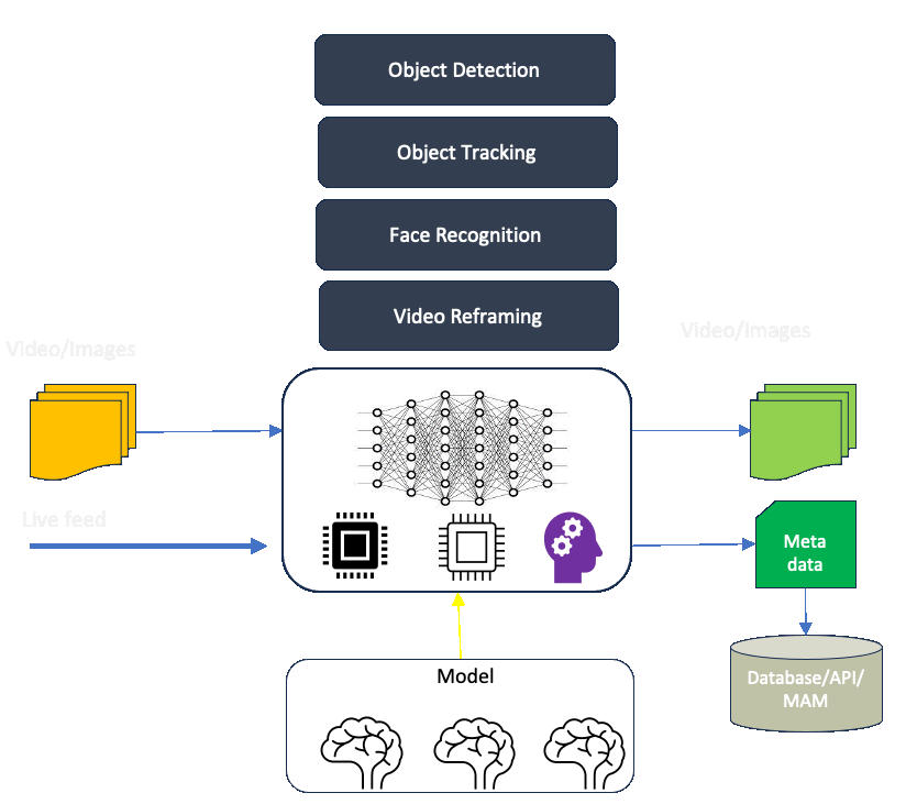 The platform receives image/video and live as data input, extracts desired meta data, reframed images as output. The results are sent to UI or integrated MAM System via API, Database.